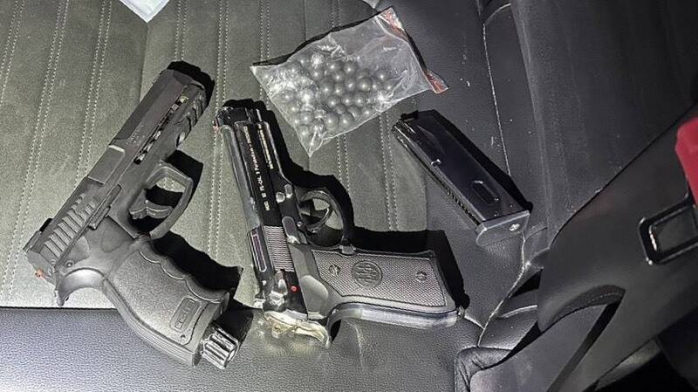 左營分局文自派出所14日夜間10時許,執行巡邏勤務至左營區文自路與重立路口,發現一輛轎車停等紅燈超越停止線,遂上前攔查,員警盤查過程中,目視車內後座有疑似刀械及槍械物品,立即通報支援優勢警力,並請車內4名民眾下車受檢。