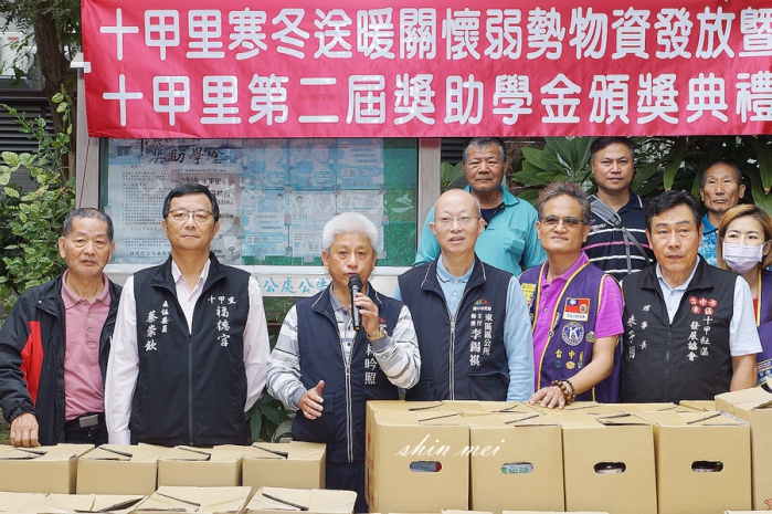 (記者陳宏昇/臺中報導)114年台中市東區「十甲里辦公處」、「福德宮管理委員會」,12月19日福德宮廣場舉行十甲里寒冬送暖關懷弱勢活動,今年第二屆獎助學金頒獎發放 (國中、高中、大學),提供中低收入戶及邊緣戶關懷慰問金每名2000元和兩大箱、一大袋物資。十甲里長林昑照感謝 福德宮蔡崇欽主任委員贊助獎學金20000元、十甲里數十位善心人士、陽光慈善協會、薪泰平同濟會等物資捐贈。