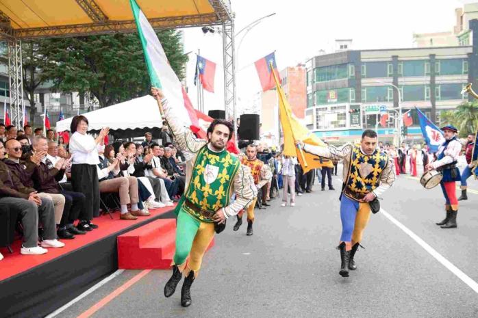 義大利管樂旗隊以戰鼓、號角與旗舞,打造出宛如古代慶典般的盛大儀式,瞬間讓市府街道化身中古世紀的義大利廣場!