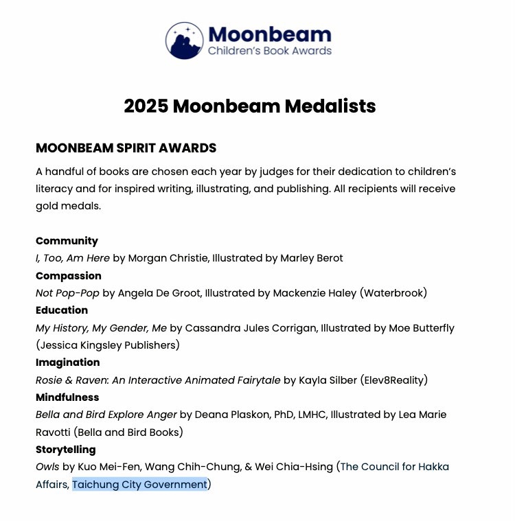 (記者陳明/臺中報導)台中市政府客家事務委員會推動客語文化創作成果再傳捷報!客語繪本《貓頭鳥》以溫潤細膩的圖像風格與生動自然的客語文字,描繪台中山城客家重要祭典文化,成功打動國際評審目光,一舉榮獲德國「ICMA國際創意媒體大獎」書籍類兒童與青少年書籍金獎,以及美國「Moonbeam兒童圖書獎」2025年度評審金獎,成為少數同時獲得歐美國際大獎肯定的客語繪本,展現台中推動客語教育與文化創作的豐碩成果,也讓台中客家故事正式走向世界。