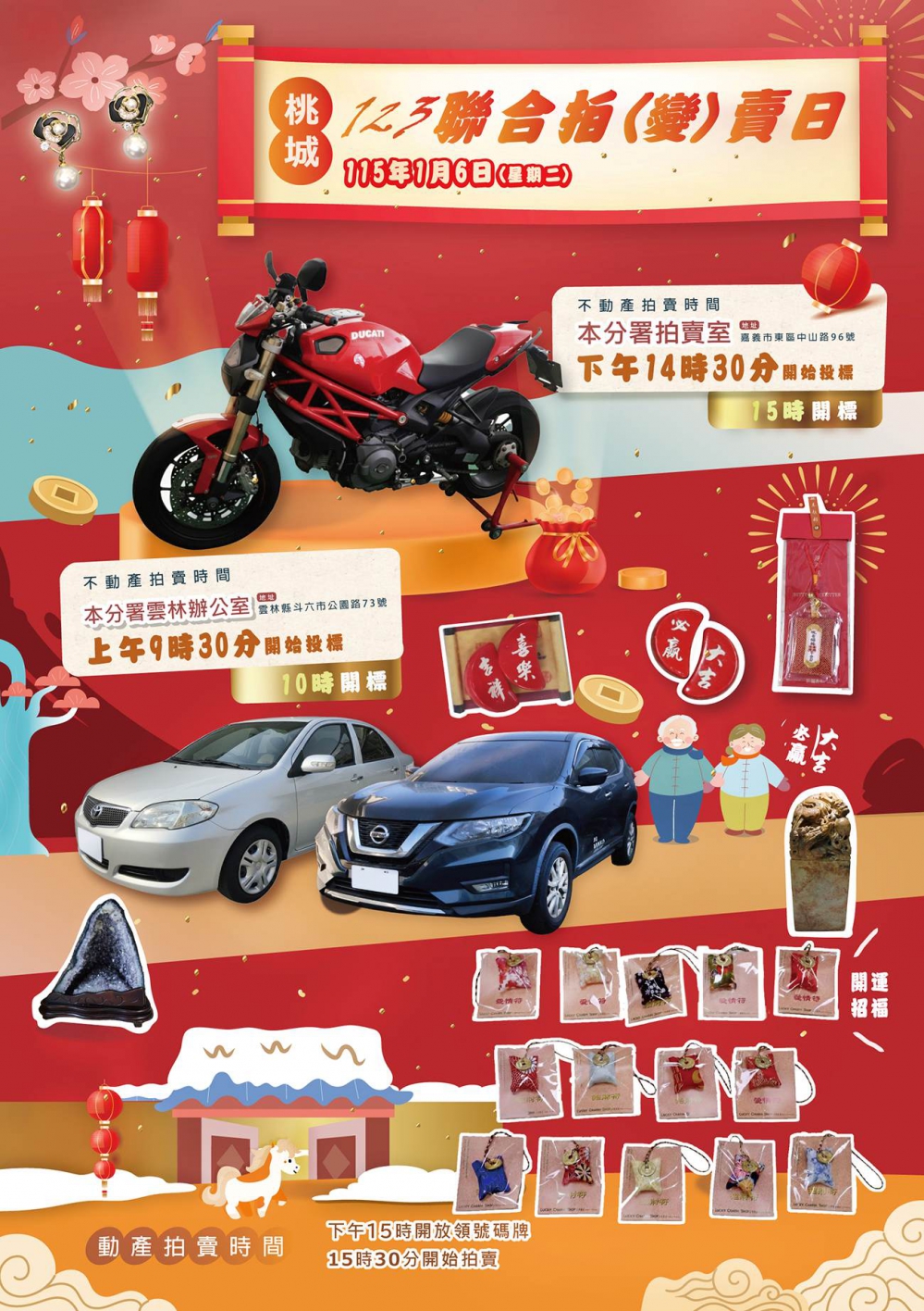 【記者張文一嘉義報導】行政執行署嘉義分署115年第1次123擴大聯合拍賣會,將於115年1月6日(星期二)舉行。嘉義縣市場當天拍賣焦點是一輛排氣量1,078c.c的DUCKTI紅色重型機車,另外並有日產、國瑞2輛轎車可供選擇,還有板信及三信等公司股票等。法拍現場並邀請嘉義市腦性麻痺協會設攤,販售麵包、餅乾、並有嘉義市聲暉協進會進行手語宣導。