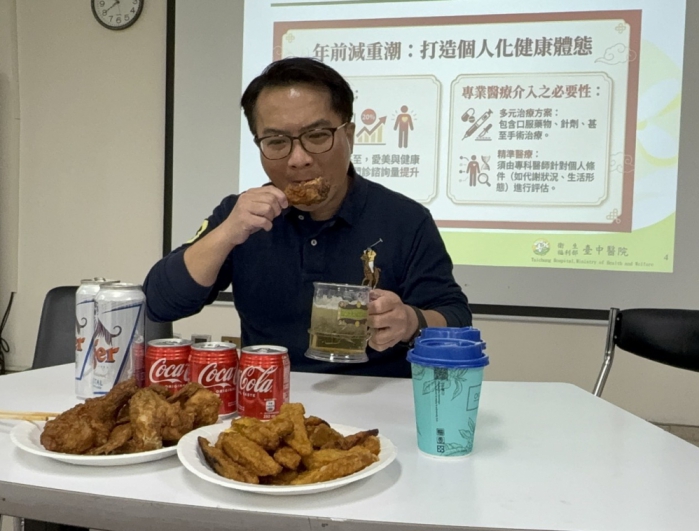 (特派員陳明/臺中報導)衛生福利部臺中醫院家醫科張祐維醫師、營養科盧靜詩主任表示;臺中一名38歲科技男,平時工作壓力大,最愛吃炸雞配啤酒、可樂紓壓,身高 172公分,體重兩年內飆到86公斤,除了出現三高,還因為肥胖罹患重度睡眠呼吸中止症,去年農曆年前到減重門診諮詢並治療,八個月透過藥物與運動、飲食調整,成功甩油18公斤,還讓睡眠呼吸中止症降至輕度,運動更讓他練成六塊肌,開心迎接健康的新年。