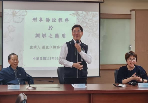 (記者陳宏昇/南屯報導)台中市南屯區公所於115年1月16日辦理調解業務研習特邀請臺中地方檢察署-蕭擁溱主任檢察官講授「刑事訴訟程序於調解之應用」。林秋萬區長感謝蕭擁溱主任檢察官百忙之中蒞臨本所指導,藉由分享調解案例,彼此互動交流,強化調解委員及行政人員刑事法學素養,讓委員們在往後相關調解案件上,能更能得心應手。