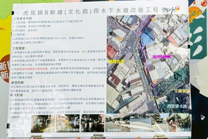 內政部國土管理署署長吳欣修於會勘時表示,虎尾鎮文化路一帶長期因排水系統受限、地下管線複雜,每逢豪雨即容易積淹水,已成為地方亟需解決的重要課題。