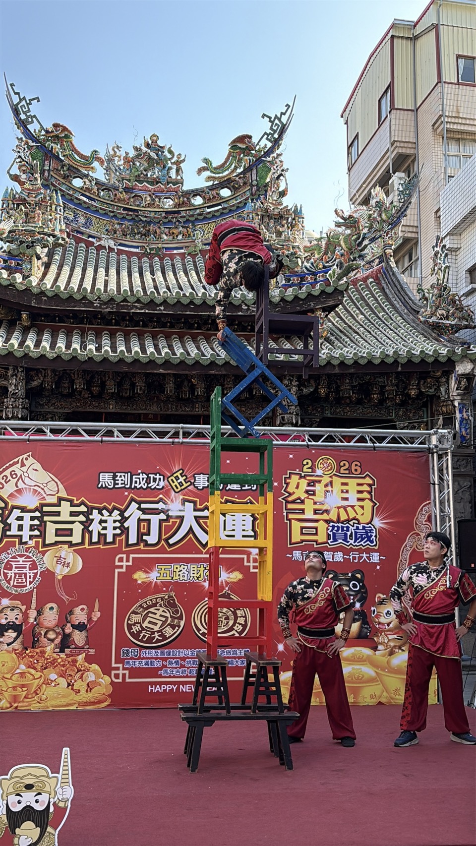 城隍廟新年創意好物「馬年吉祥、超越顛峰」錢母吊飾發表會,特別邀請「火悟空特技劇坊」帶來《馬躍嘉慶.技翻巔峰》震撼演出。將國粹戲曲的身段與高難度體能極限完美融合,演員化身靈馬展現翻騰乾坤之勢一開場便以連環「地毯翻騰」點燃現場氣氛,象徵馬年奔騰不息的生命力;又驚人的「倒立平衡」神技,在靜止中展現穩重如山的定力,倒立與翻滾特技正代表著「轉機」與「突破」。廟方也期待透過這場力與美的藝術饗宴,象徵城隍爺威靈顯赫將平安與福氣傳遞給每一位信眾,守護社會安定、翻轉運勢、招財進寶。