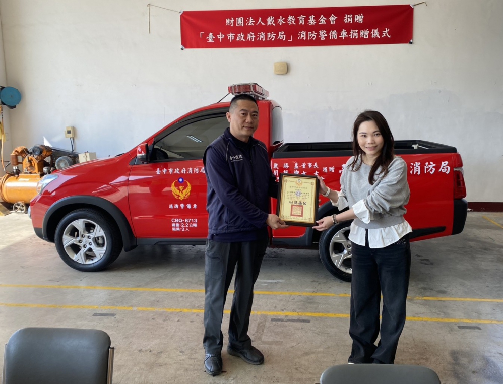 (特派員陳明/臺中報導)財團法人戴水教育基金會秉持「推動公益、關懷社會」的宗旨,今(20)日上午於台中市政府消防局清水消防分隊舉行捐贈儀式,捐贈消防警備車1輛,提升第四救災救護大隊清水分隊救災戰力,由副大隊長許修豪代表受贈並回贈感謝狀,感謝基金會及董事長戴勝益對消防工作的熱心支持,展現財團法人回饋鄉里的具體行動力。