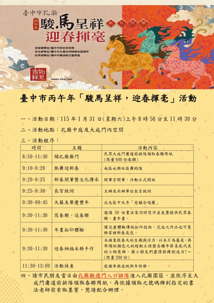 福馬賀歲迎春 台中孔廟1月31日 駿馬呈祥 迎春揮毫 贈春聯年畫
