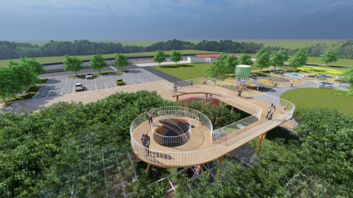 王縣長說,本工程將主廟參拜區域重新規劃,針對動線重新鋪面整理,設置大榕公歷史故事牆,打造地標「榕光塔」,讓遊客從高處眺望大榕公氣勢和河濱景色,新設供兒童遊玩的「祥龍探索遊戲場」,以祥龍戲水為意象,結合盪鞦韆、跳跳床、傳聲筒等設施,可攀爬、擺盪、休憩、噴灑水霧,讓大小朋友享受悠閒運動時光。