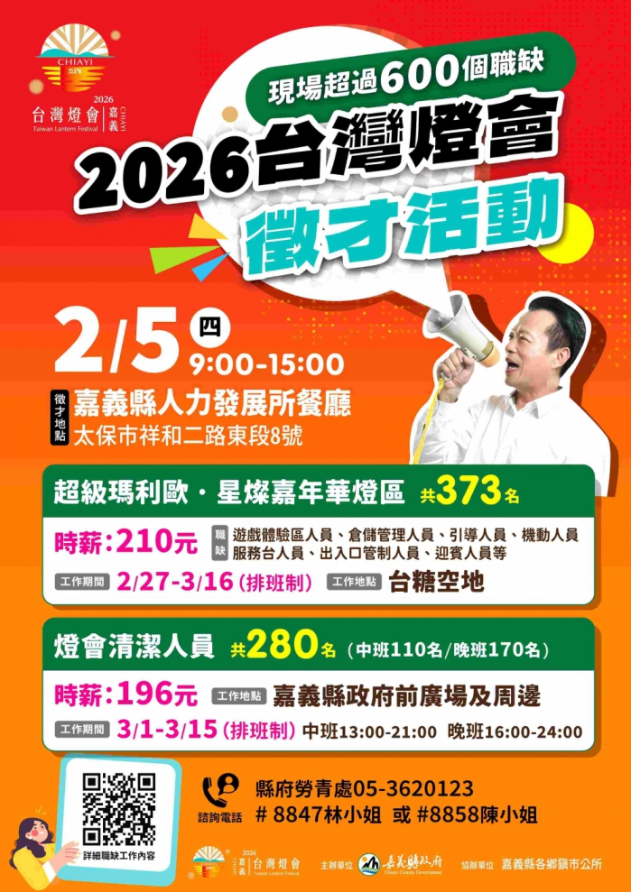 【雲嘉特派員陳信利/嘉義縣報導】嘉義縣政府為迎接2026台灣燈會,將在2月5日(周四)上午9點至下午3點,於嘉義縣人力發展所舉辦專場徵才活動,釋出超過600個工作機會,歡迎鄉親朋友踴躍報名。