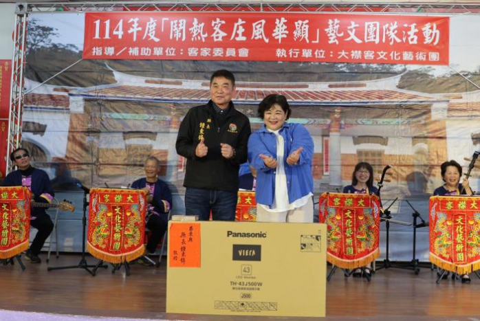 (特派員陳明/苗栗報導)大襟客客家文化藝術協會1月24日舉辦第2屆會員成果展演發表會,縣長鍾東錦到場欣賞珍貴的客家藝術,感受客家文化的深厚底蘊,強調客家語言、藝術、文化的重要,為感謝協會對客家文化傳承的努力,縣長當場加碼抽獎一台電視,將氣氛炒熱至最高點。