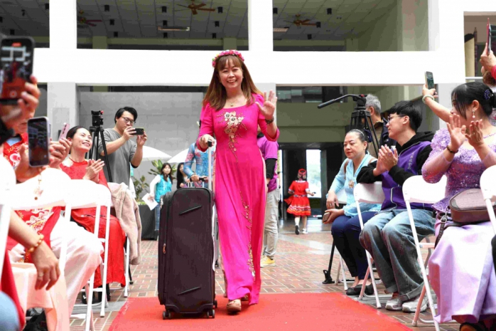7位來自越南、印尼、緬甸等國的新住民姊妹,手拉行李箱緩步登場,以身體敘事呈現「離鄉、扎根、共築新家」的生命歷程,呼應本燈區主軸—「從遠方而來,走進嘉義、走進家」,將新住民燈區定位為一座蘊含理解、共感與祝福的光影嘉年華。