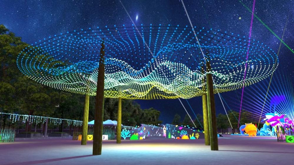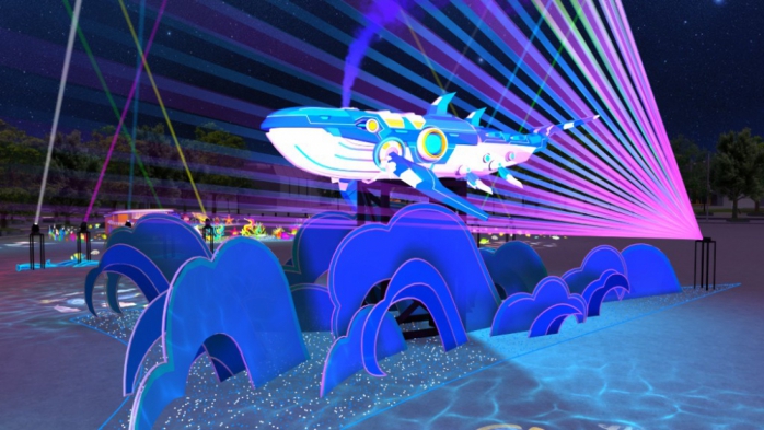 此外,「鯨魚戰艦在夜空中啟航」,在2-3層樓高夜空中,主燈機械鯨魚戰艦於夜空中啟航,以未來感十足的身軀與光影,領航全區視覺焦點,也象徵守護海洋生態的核心力量鎮。