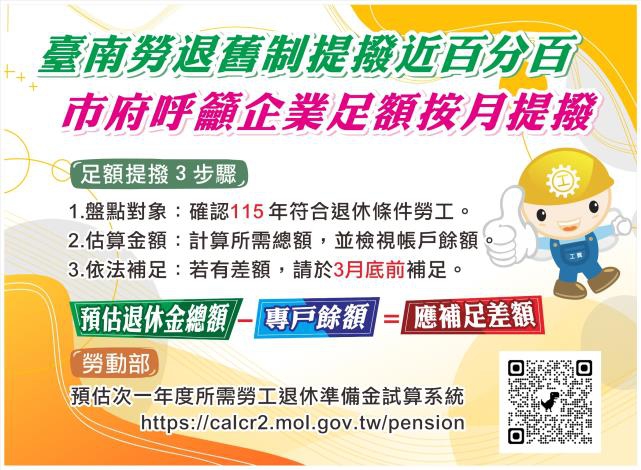 為落實黃偉哲市長「希望家園」施政理念,打造讓勞工安心工作的友善環境,臺南市政府持續強化勞工退休權益保障。勞工局提醒,依據《勞動基準法》第56條第2項規定,適用舊制退休金制度之事業單位,對於當年度符合退休條件的勞工,應於每年3月底前補足退休準備金差額,確保勞工退休權益不受影響,呼籲事業單位務必依規定辦理。