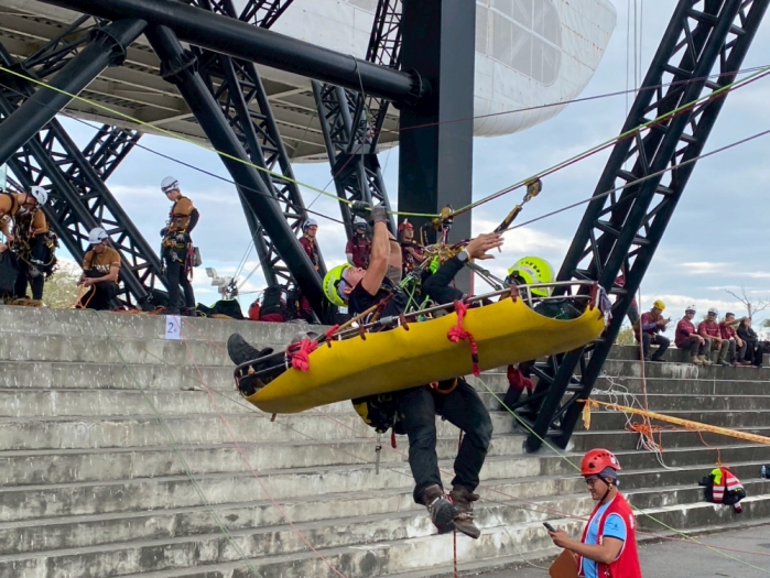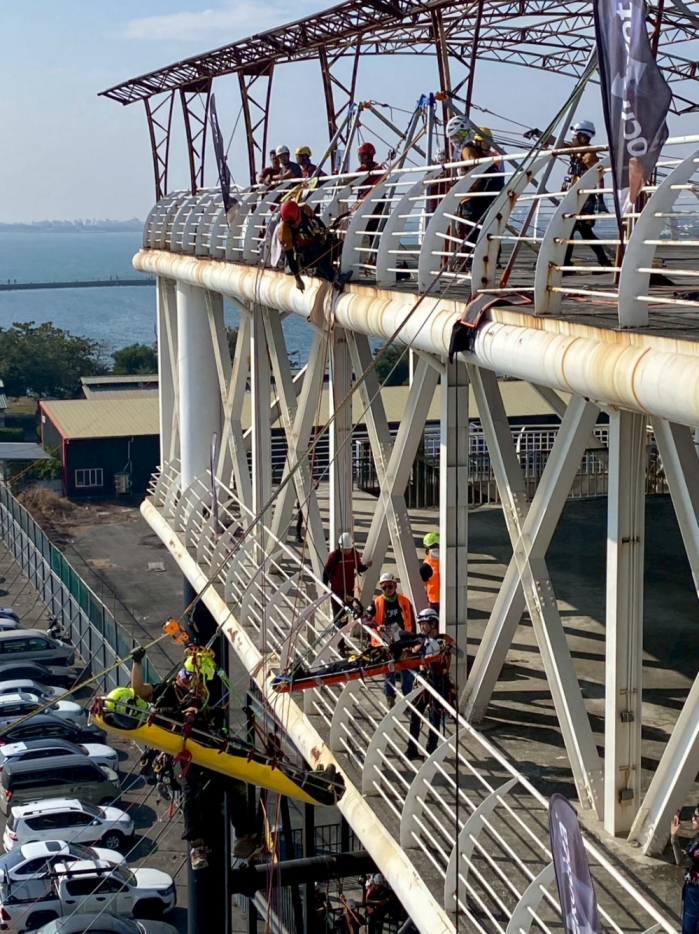 消防局指出,賽事內容設計高度貼近實際救災場景,首日即以極限體能測驗作為開場,隨後進入高空作業、複雜地形通過及多重情境模擬等關卡,全面考驗隊員的體能、技術、判斷力與心理韌性。在長時間高張力操作下,肌肉疲勞與精神壓力不斷累積,但災害現場從不給予任何喘息空間,每次操作都攸關團隊安全與任務成敗。