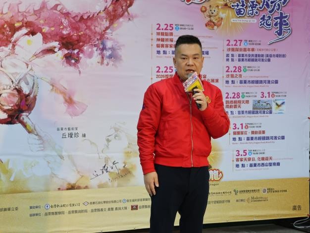 苗栗市長余文忠表示,2026苗栗(火旁)龍系列活動將於2月25日在苗栗玉清宮舉辦祥龍點睛神龍祈福及貓裏客家龍競技;2月27日於苗栗經國路河濱公園舉辦(火旁)龍踩街嘉年華;2月28日於經國路河濱公園登場(火旁)龍之夜;3月5日在苗栗西山聖帝廟舉辦化龍返天儀式。