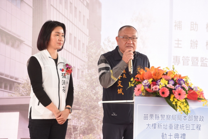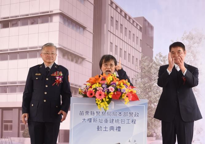 內政部長劉世芳表示,新建警政大樓經過千轉百折後,終於還是克服萬難順利動土,這項工程中央負擔82%經費,顯示對苗栗警政建設和治安的重視,她引用一項國際評比指出,由於台灣治安良好,在過去10年間一直是外商投資的首選,至於警政大樓後續所需軟硬體設備,內政部將持續挹注資源協助。劉世芳強調,內政部近年來挹注在苗栗公共工程建設約有9億元,有6.5億用在汙水下水道工程,2億投入人行道安全設施等,中央與地方一直是合作夥伴。