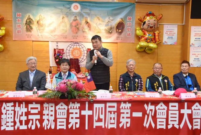 (特派員陳明/頭份報導)苗栗縣鍾姓宗親會8日召開第14屆第1次會員大會,縣長鍾東錦出席祭祖及唱族歌等儀式,表達慎終追遠孝思及弘揚輝煌德業,並受邀暢談苗栗願景。鍾東錦細說推動興建天花湖水庫、人本交通、成立長照處及公共設施用地解編的努力過程,堅信縣政推動一定要開大門、走大路,重視溝通以排除阻力,也要敢開口向中央爭取資源,強調未來縣政仍堅持以多數人利益為前提。鍾姓宗親會會員大會今天上午在頭份市公所藝術館召開,由原理事長鍾道明主持,除縣長鍾東錦與縣內宗親與會之外,還有來自宜蘭、雙北、桃竹苗及中南部各縣市宗親會代表參加;會中同時進行第14屆理監事及理事長等選舉。鍾東錦以「鍾聲揚萬里、潁川濟千秋」對聯致賀,並主持祭祖、唱族歌、唸祖訓等,儀式莊嚴而隆重;隨後並頒發獎牌獎金表揚優秀宗親和品學兼優學子,另致贈宗親馬年福袋。