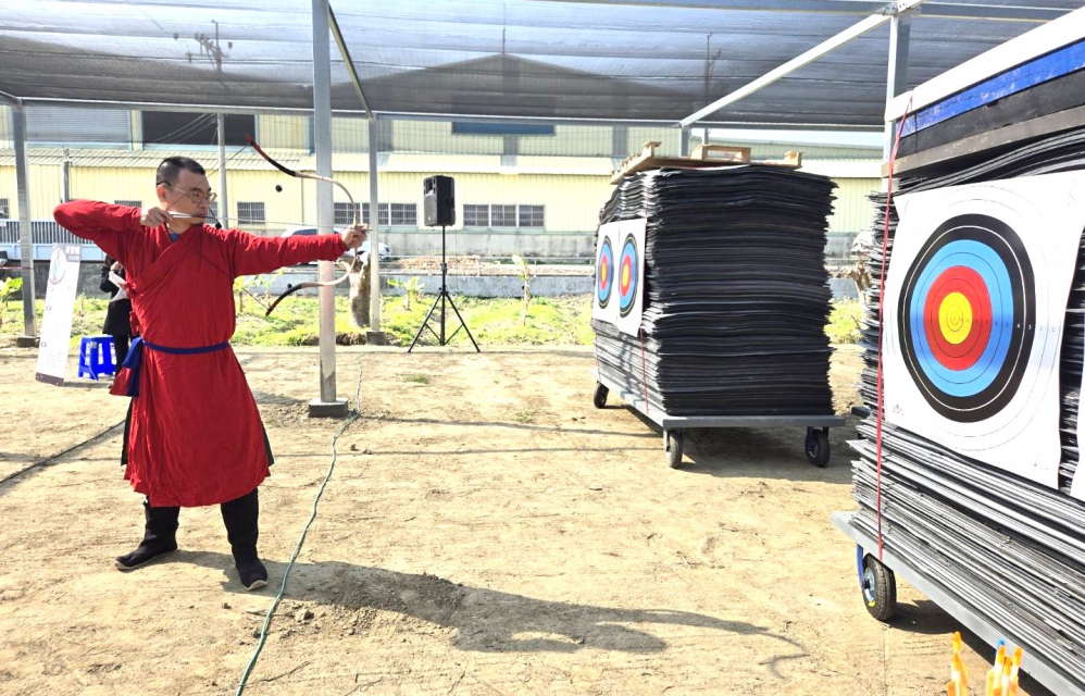 【記者陳信利/雲林報導】斗南鎮羊羊得藝教育農場今天(9日)舉辦雲林縣首座弓箭場啟用活動,弓箭教練陳宏曜結合知名陶藝家父親陳永礎,營造羊羊得藝教育農場賞陶藝、練弓箭優美環境。