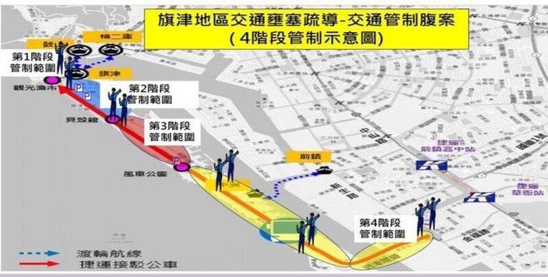 「旗津地區」交管時間為10時至21時,廟前路14時至20時管制為行人徒步區,並於貝殼館、風車公園及過港隧道前鎮端分階段截流管制車輛進入;視情況實施單向通行,離開旗津車輛統一由廣澤街駛離。建議搭乘捷運轉渡輪或公車前往。