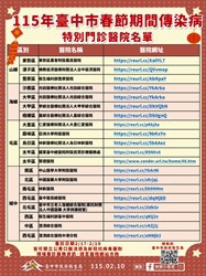 (特派員陳明/臺中報導)農曆春節將至,今(115)年春節連假長達9天,返鄉及聚會活動增加,加上近期氣溫變化劇烈,依衛生福利部疾病管制署監測資料顯示,國內類流感門急診就醫人次呈現緩升趨勢。台中市政府衛生局為確保春節期間醫療量能穩定運作並有效落實分流看診,已協調台中市19家醫院(20院區),於2月17日至2月19日(農曆初一至初三)開設「春節傳染病特別門診」,並提供公費流感及新冠口服抗病毒藥劑開立服務,提升民眾就醫可近性,減輕急診壅塞壓力。