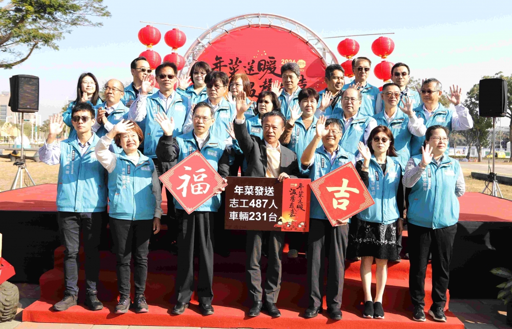 縣府今天上午於縣府前廣場舉行出發儀式,志工一早就將年菜逐一上車,開到府前廣場整齊併排,綿延的車隊在翁縣長等人揮手目送下出發執行愛心任務