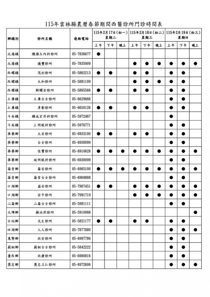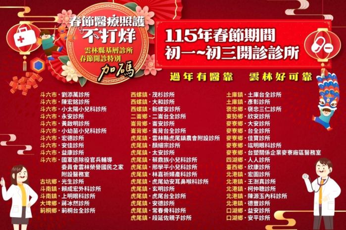 此外,在急重症醫療方面,春節連假期間雲林縣6家急救責任醫院,將全面維持24小時急診服務,衛生局每日即時掌握各院急診候診及待床情形,與責任醫院密切合作、即時應變,確保急重症患者獲得妥適照護,並於農曆初一至初三加開傳染病特別門診。