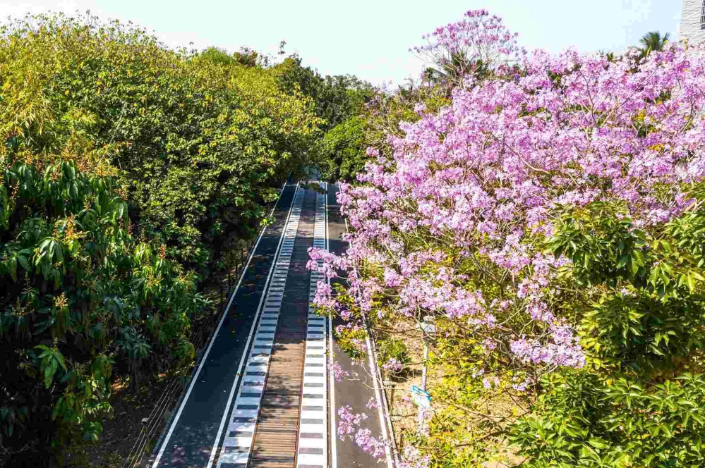 緊接著飛躍城市來到嘉義市立美術館,感受建築新舊融合之美,與藝術深度對話,當然也不會錯過有「南部最美自行車道」之稱的嘉油鐵馬道,應景的洋紅風鈴木正盛開,正適合遊來趟自行車之旅,徜徉在浪漫粉紅中。