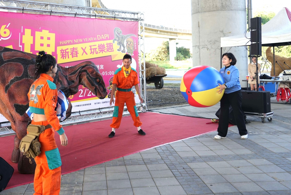 張縣長前往「2026大埤新春×玩樂趣」活動會場,與縣府文化觀光處長謝明璇、大埤鄉長林森寳等人一同發放福袋,向鄉親送上誠摯祝福,並與民眾觀賞恐龍劇場與體驗飄浮車,在歡笑聲中感受農村創意與活力。