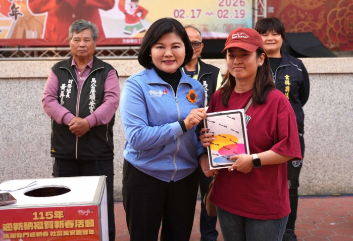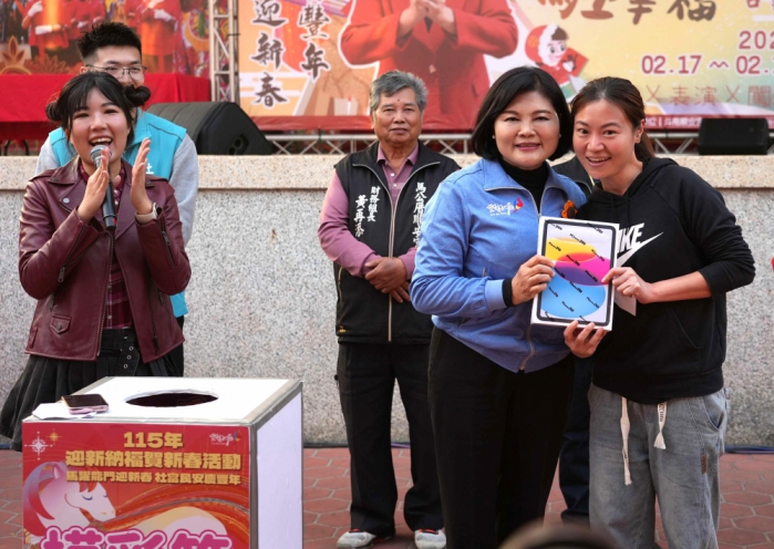 她並代表主辦單位抽出活動頭獎「平板電腦」幸運得主,在鄉親熱情歡呼聲中加碼6個紅包及2台平板電腦,將現場氣氛推向最高潮,廟埕洋溢濃濃年味與歡樂笑聲。