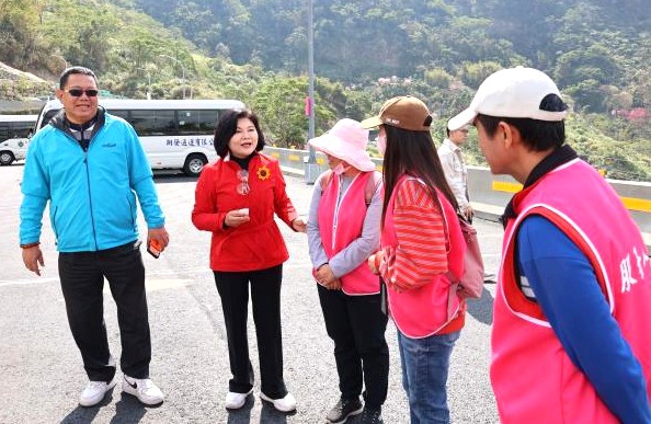 縣長張麗善今天(20日)會同副縣長謝淑亞、古坑鄉長林慧如、交通工務局長汪令堯及縣議員蔡東富夫人洪惠玲理事長等人前往草嶺地區,實地勘查櫻花季期間交通接駁與疏運狀況,並慰勞辛苦執勤工作人員,感謝大家在春節期間堅守崗位,守護遊客安全與交通順暢。
