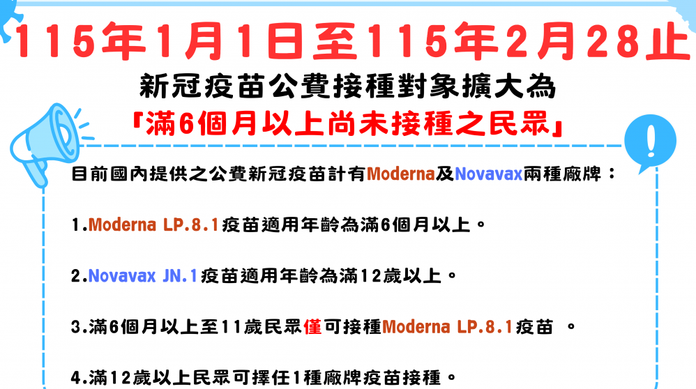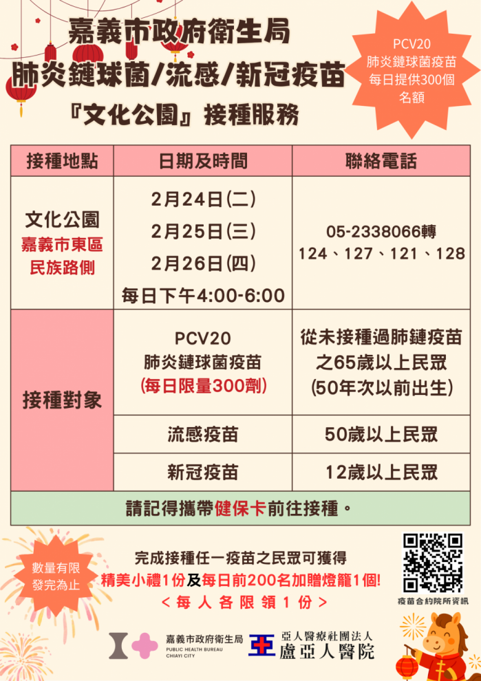 此外,市府衛生局將於2月24日、25日及26日3天下午4-6時,在文化公園(民族路側) 設立肺炎鏈球菌、流感及新冠疫苗接種站。