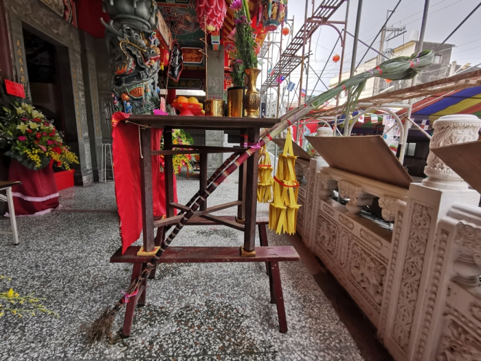 二、簡單式:供桌沒有「頂桌」和「下桌」,只有單一平面,在家門口外沒有遮蔽的的地方設供桌,就像平常拜門口一樣,只有平常的供桌,但為求尊崇之意,會在供桌的四隻腳底下墊上壽金,供品一定要素的,絕對不可以拜葷食!一般是5種水果。