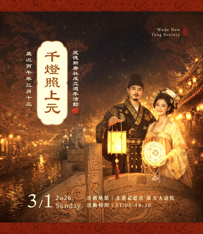 文化觀光處表示,為即將迎來的元宵節,北港燈會更有一系列活動,北港武德宮於3月1日將舉辦「千燈照上元,武德新唐社成立週年雅集」,屆時將有近50位身著唐代華麗服飾的型男仕女們,提燈遊行於北港古鎮。