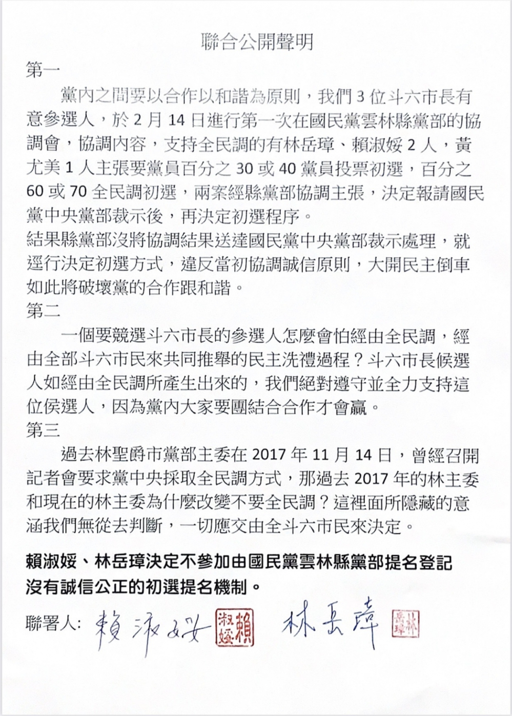 第三、過去林聖爵市黨部主委在2017年11月14日,曾經召開記者會要求黨中央採取全民調方式,過去的林主委和現在的林主委為什麽改變不要全民調?這裡面所隱藏的意涵我們無從去判斷,一切應交由全斗六市民來決定。賴淑媛、林岳璋決定不參加登記國民黨雲林縣黨部沒有誠信公正的初選提名機制。」