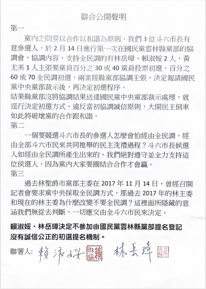 「第一、黨內之間要以合作以和諧為原則,我們3位斗六市長有意參選人,於2月14日進行第一次在國民黨雲林縣黨部的協調會,協調內容,支持全民調的有林岳璋、賴淑媛2人,黃尤美1人主張要百分之30或40黨員投票及百分之60或70全民調初選,兩案經縣黨部協調,決定報請國民黨中央黨部裁示後,再決定初選程序。