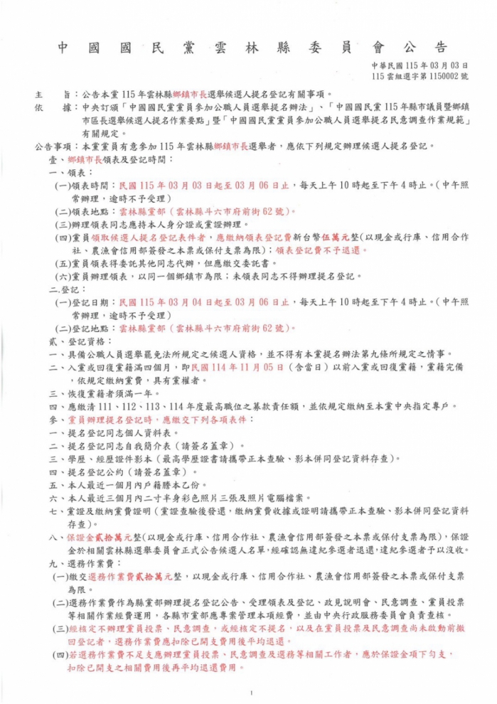其中民意調查作業將於3月27日前辦理,28日(周六)舉行黨員投票,再核計參與爭取提名者黨員投票及民意調查結果,經縣黨部提名審核程序後,報請黨中央核定公告提名。