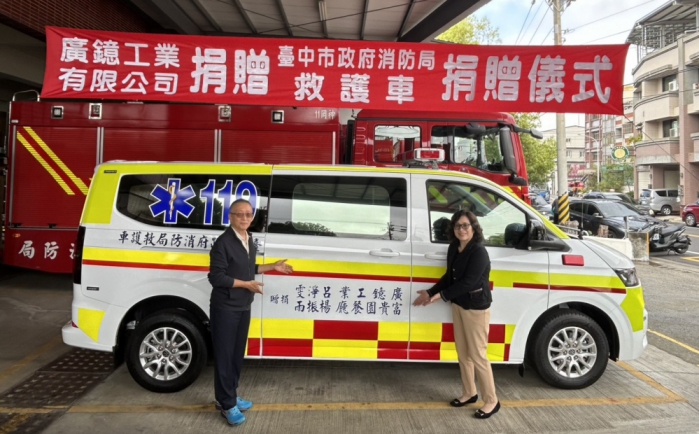 (特派員陳明/神岡報導)隨著台中市神岡地區快速發展與人口增加,第一線緊急救護勤務量日益繁重,台中市政府消防局第一救災救護大隊神岡分隊的救護車輛使用頻率遽增,耗損與維修率亦隨之提高。在地深耕的知名企業「廣鐿工業有限公司」深切體察此一需求,負責人呂淨雯女士長年熱心地方公益、造福鄉里不遺餘力,基於對消防救護工作的高度肯定與支持,捐贈一輛造價高達新臺幣410萬元的全新救護車及救護器材裝備,以實際行動回饋社會,期能提升台中市到院前的緊急救護品質,嘉惠廣大市民。