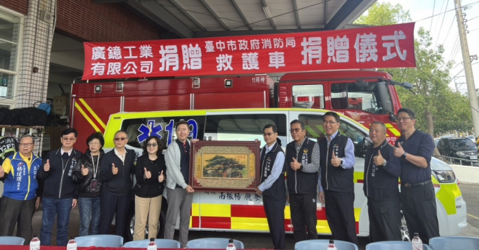 消防局表示,捐贈儀式於今(6)日上午10時,在神岡分隊溫馨而隆重地舉行。在眾多貴賓的見證下,由呂淨雯女士親手將救護車鑰匙交予消防局副局長戴峻焜,戴副局長也回贈感謝匾額,代表台中市消防局向廣鐿工業的無私奉獻,致上最誠摯的謝意。