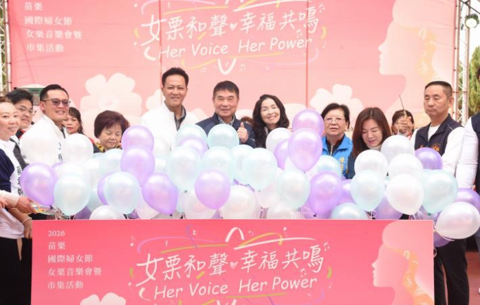「女栗和聲・幸福共鳴」婦女節慶祝活動,今日上午由縣長鍾東錦與夫人陳美琦伉儷,偕同立委邱鎮軍、陳超明夫人吳麗利與縣議員、代表及婦女團體幹部,一起以釋放氣球升空方式啟動各項節目,隨後以大合唱讚頌婦女節。會場周邊設有簽名打卡牆,中央大道兩旁則有數十個攤位,展售青創、藝文創作商品和農特產。