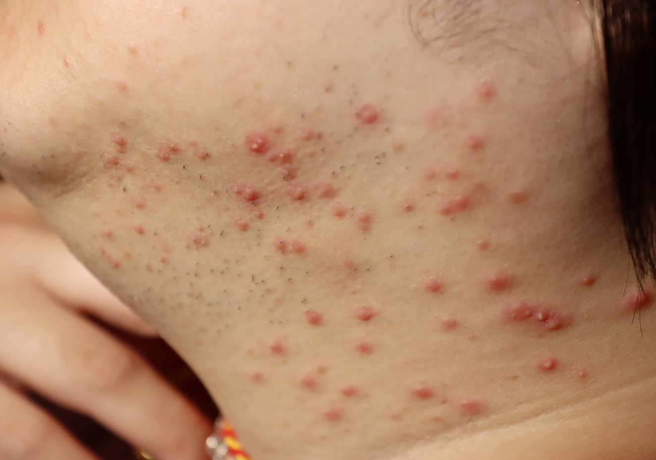 鍾佩宜醫師指出,毛囊炎與濕疹的臨床表現看起來相似,常讓民眾難以分辨。正常皮膚本就存在細菌與黴菌,一旦毛囊受到感染或發炎,就會在患部周圍出現紅腫、搔癢、膿皰等症狀,有時長出的痘痘還會伴隨疼痛,這就是毛囊炎。輕度毛囊炎通常可自行痊癒,但若發炎嚴重,應立即就醫檢查與治療。