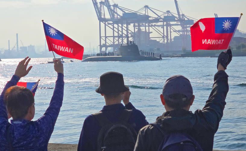 【記者陳信銘/高雄報導】潛艦國造原型艦海鯤艦今(12)天進行第6次潛航測試,軍事迷揮舞手中印有TAIWAN的自製國旗,為海鯤艦加油。軍事專家表示,依目前潛航測試頻率,海鯤艦有機會在6月交艦。