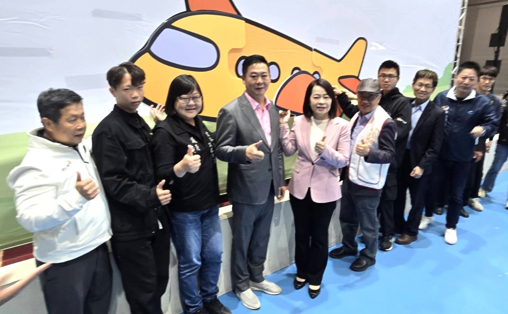 陳主委等人共同拼貼遨翔的飛機,包括推進器、操縱桿、輪胎及螺絲、板手、機油等零件逐一完成組裝,讓家扶學子得以穩固腳步與基礎,補足強大的能量展翅高飛!