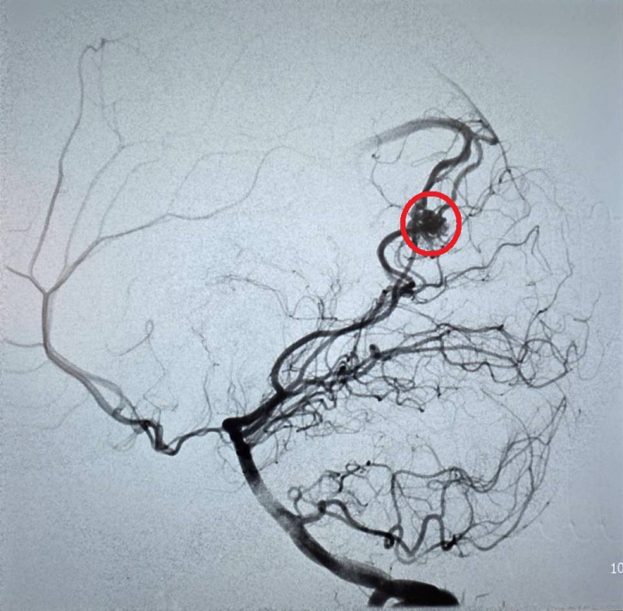 (特派員劉鳳瑩、陳明/苗栗報導)23歲的周小姐正值青春年華,日前卻在毫無預兆下感到一陣劇烈頭痛,隨即伴隨嚴重的頭暈與嘔吐感,家屬見狀趕緊將她送往大千綜合醫院急診。經腦部電腦斷層掃描,醫師赫然發現其左側腦部有出血跡象,且出血位置極其不尋常。醫療團隊隨即展開精密檢查,證實為罕見的「顱內動靜脈畸形」引發出血。所幸在神經放射科康靜維醫師及時進行微創血管內栓塞治療後,順利止住出血,病人症狀明顯改善,成功化解一場腦內危機。