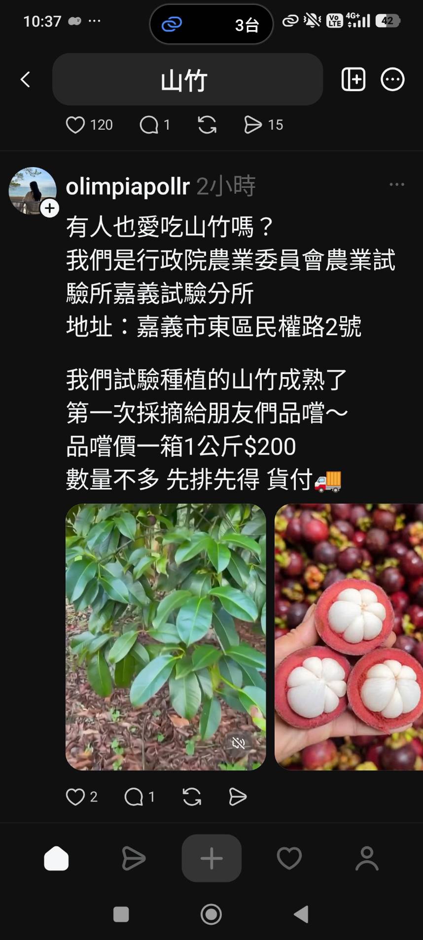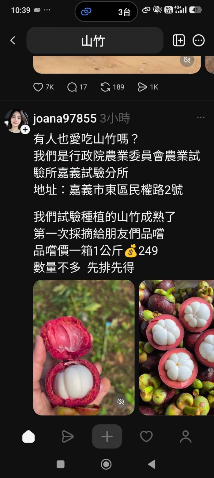 【記者張文一嘉義報導】農業試驗所近日於 Threads、Instagram (IG) 等社群媒體平台上,頻繁發現不法帳號假冒農業試驗所鳳山熱帶園藝試驗分所及嘉義農業試驗分所之名義,聲稱販售試驗種植之山竹或蜜棗。農業試驗所二十日發布嚴正聲明,強調該所及所屬分所從未參與任何商業買賣,請民眾提高警覺,切勿上當。