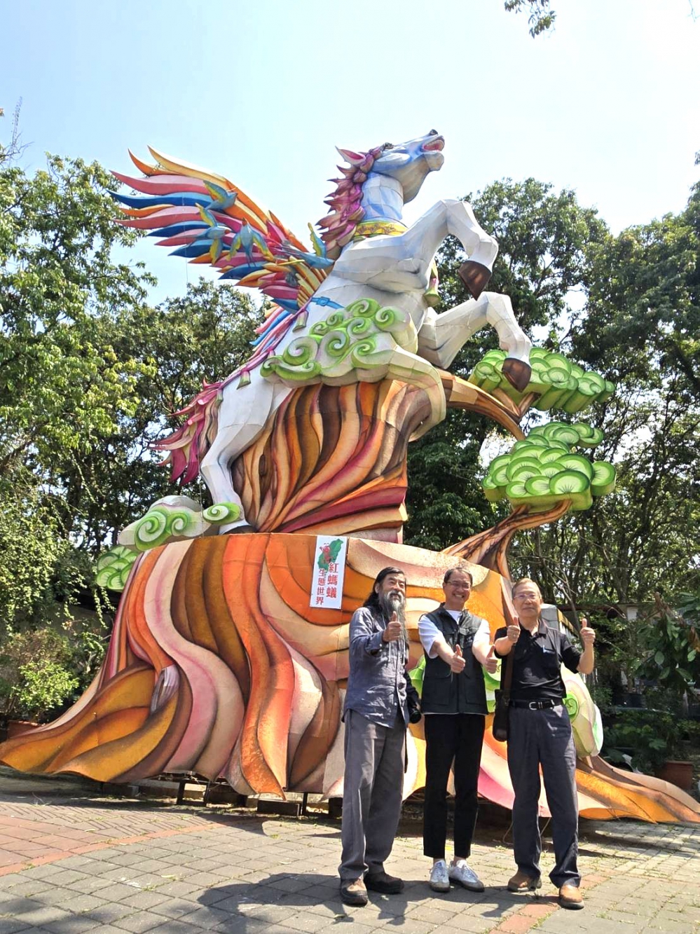 「夢幻飛馬在紅螞蟻園區重新點亮啦!」林明期說,歡迎遊客來賞花、看蝴蝶、找樹蛙、看恐龍並欣賞七彩飛馬花燈,日日都精彩,四季都好玩!