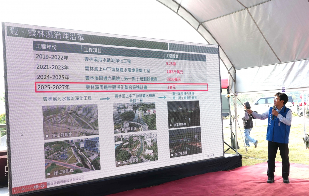 此次推動「雲林溪2.0」,再投入3億元辦理7項景觀工程,分為4標同步施工,自今年3月起陸續開工,除部分建築工程預計於明年完成,其餘工程可望於今年內陸續完工。