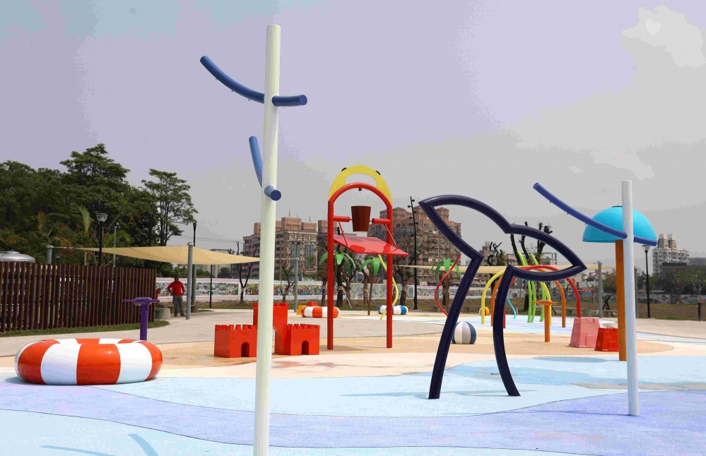 公園內親水公園以「兒童戲水區」為核心主軸,規劃設置安全且具互動性的親水遊憩設施,並搭配完善的休憩空間與景觀綠化設計,提供親子共遊的優質環境。