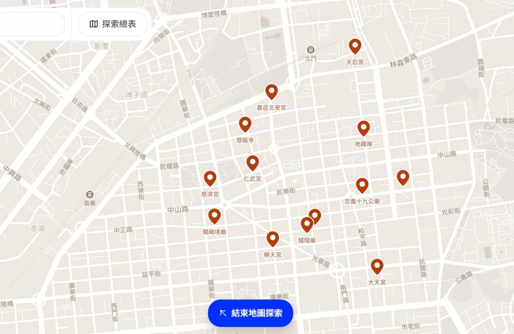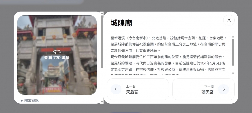 市府去年推出的「來嘉跑TEMPLE」數位導覽平台,整合嘉市17間具代表性宗教團體,運用720度環景技術與多國語系(中、英、日、韓、台)導覽系統,完成宗教文化數位典藏。