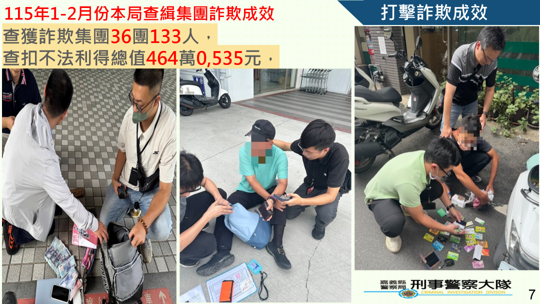 嘉義縣警察局結合辦理115年2月份分析詐欺情勢報告,在打擊詐欺犯罪部分查緝集團詐欺成效共查獲詐欺集36團133人,查扣不法利得總值464萬0,535元。攔阻詐欺件數部分,統計115年1-2月份則有31件、2,073萬8,595元,較114年同期增加2件、271萬2,164元;在詐欺犯罪發生趨勢部分,根據打詐儀錶板分析,嘉義縣115年2月份詐欺案件受理數118件,財損金額新臺幣2,563萬7,000元,與114年同期數據相比較,受理件數減少77件(-39.48%)、財損金額減少4,220萬7,000元(-62.21%);另以行政區統計,民雄鄉(19件)、朴子市(16件)、太保市(12件)、竹崎鄉(12件)、水上鄉(10件)為高發地區;以詐騙手法分析,則以「網路購物詐騙」詐騙計37件最多(占31.35%)、「假交友(投資詐財)」詐騙計12件次之(占10.16%)、「假交友(徵婚詐財)」詐騙計11件再次之(占9.32%),網路購物詐騙案件已有明顯竄升趨勢,位居高發案類冠軍,惟投資詐騙(含假交友投資)在財損部分依然位居各類手法首位,占財損總額80.71%,提醒民眾投資前務必謹慎查證,切勿輕信不實廣告,以免誤墜詐騙陷阱。