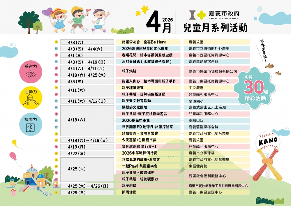 嘉義市「兒童月系列活動」將貫穿整個4月!市府強調,後續將接力推出兒童園遊會、天文教育、文化市集、親子烘焙及繪本導讀等多元節目。
